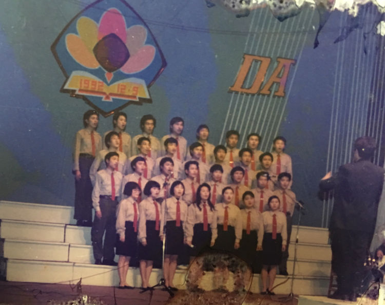 一九九零年九月的迎新季,就是在这个大礼堂前,遇到了河大迎新的可亲可爱的老师和同学们,当时没有远离家乡的悲苦孤独,怀着满心的喜欢和期待,开启了我在河大求学的新篇章。也是在这里,举行纪念一二·九运动的大合唱比赛,为了统一服装,九零级历史糸的女生们也是拼了,我们冒着严寒,穿着夏天的裙装,高唱着“大刀向鬼子们的头上砍去……”(那时候,学校还没有暖气,开封的冬天特别干冷。室友萍儿说,踩着大礼堂的木质地板,感觉好神秘啊!)还是在这里,每周六,都要买张2角钱一张的电影票,在大礼堂美美的看上一场电影,并以此做为谈资,在寝室卧谈会上,指点江山,激扬文字…还有在这里举办的元旦晚会,晚会上,满头白发的中文系老教授声情并茂的朗诵了一首诗,我第一次发现,原来文字可以朗诵的如音乐一般的动听!原来白发也可以这么美!若有诗书藏于心,岁月真的是从不败美人的。音乐系的一个男生边弹边唱:“让我一次爱个够……”哑哑的嗓音,摇滚音乐,嗨燃了全场……