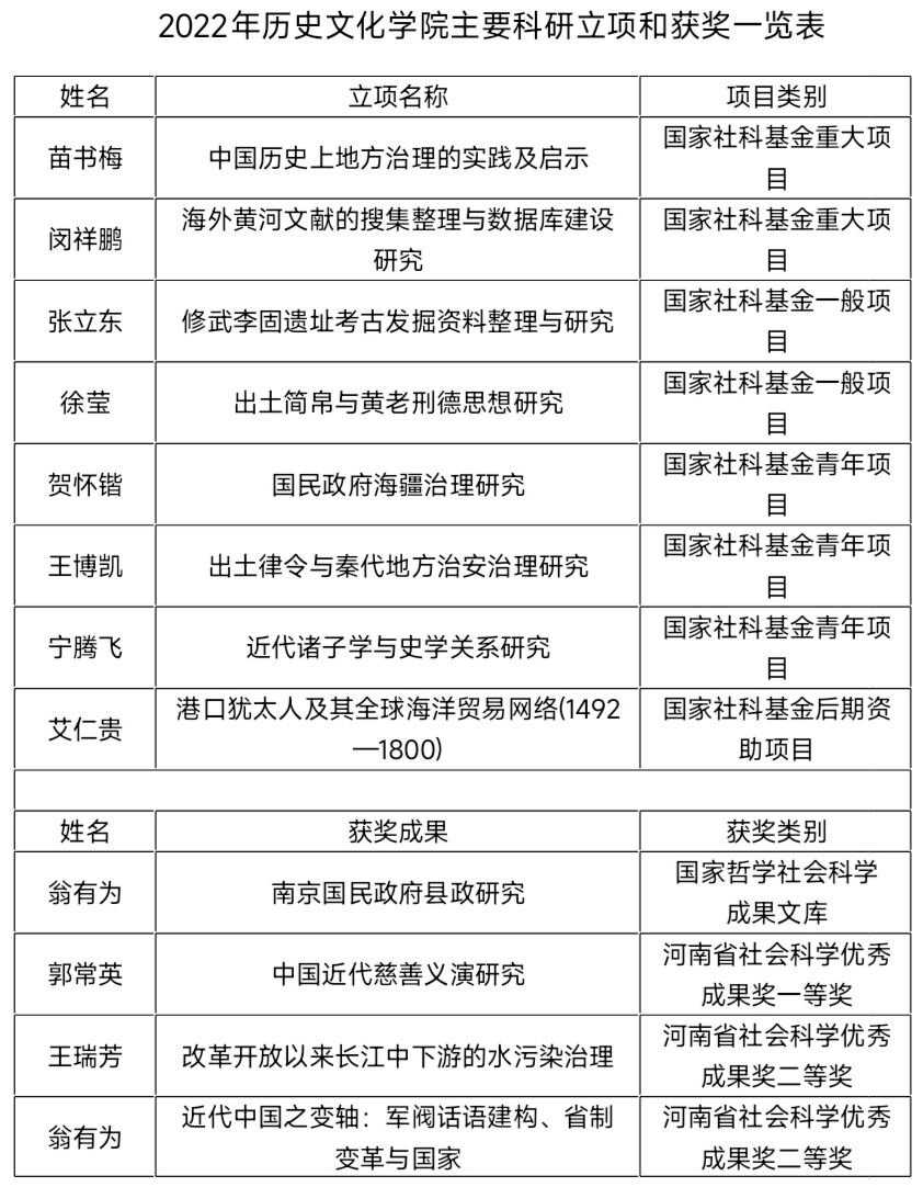 2022年金沙9001cc以诚为本首页获各类科研奖励12项。翁有为教授的《南京国民政府县政研究》入选国家哲学社会科学成果文库。郭常英教授获河南省社会科学优秀成果奖一等奖,王瑞芳教授和翁有为教授获二等奖。