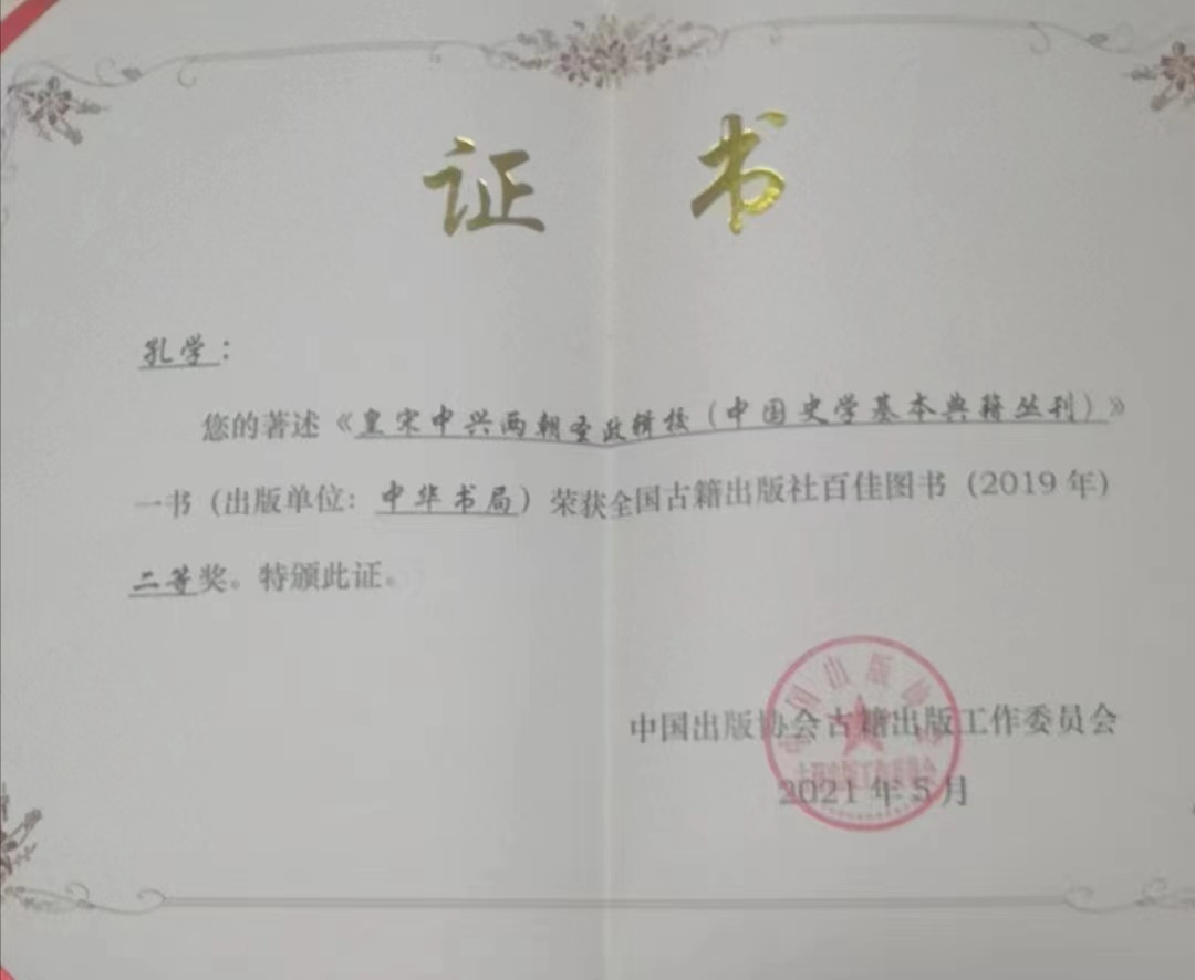 《皇宋中兴两朝圣政》是南宋人编撰的南宋开国两朝皇帝宋高宗、宋孝宗时代的编年史,在按时间顺序记载史实之外,把所有国家大事分为十五门编成分类事目以便检索,并随文附入当时著名大臣的评论以供科举参考,具有很高的史料价值。孔学副教授《皇宋中兴两朝圣政辑校》是首次对该书进行整理,全套5册,116万余字,列入中华书局“中国史学基本典籍丛刊”,2019年5月出版。