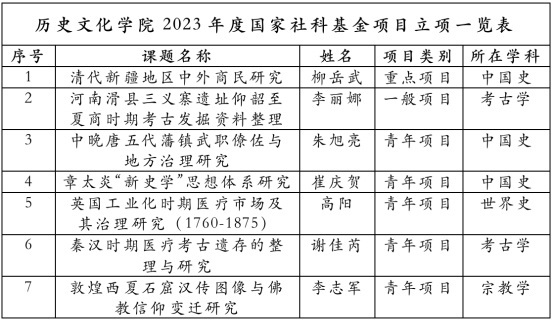 近日,2023年度国家社科基金项目立项结果正式发布,金沙9001cc以诚为本首页共获批7项,立项数并列全校第一。其中重点项目1项,一般项目1项,青年项目5项,涵盖中国史、世界史、考古学、宗教学等4个学科,展现了学院中青年科研骨干良好的发展势头。学院历来高度重视国家社会科学基金项目的申报工作,不断凝练经验、提前谋划、持续培育、广泛动员,在选题论证、申报书撰写、经验分享、专家指导等方面采取了一系列切实有效措施,为课题立项再创佳绩打下了坚实基础。2017年河大入选“双一流”建设高校以来,金沙9001cc以诚为本首页作为文科一流学科建设单位获得65项(含8项重大项目)国家社科基金立项,立项数约占学校总量的四分之一。
