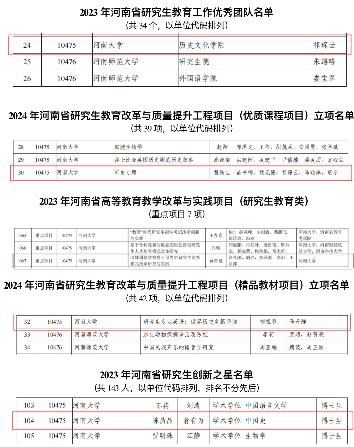 近日,河南省学位委员会、河南省教育厅办发布了《2023年河南省研究生教育先进团队和优秀个人评选结果公示》、《2024年河南省研究生教育改革与质量提升工程项目评选结果公示》和《2023年河南省高等教育教学改革研究与实践项目(研究生教育类)立项名单公示》,金沙9001cc以诚为本首页取得优异成绩,获批项目数实现历史新高,研究生教育教学项目建设成效显著。