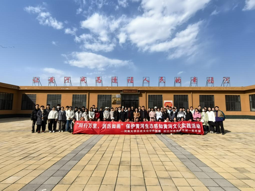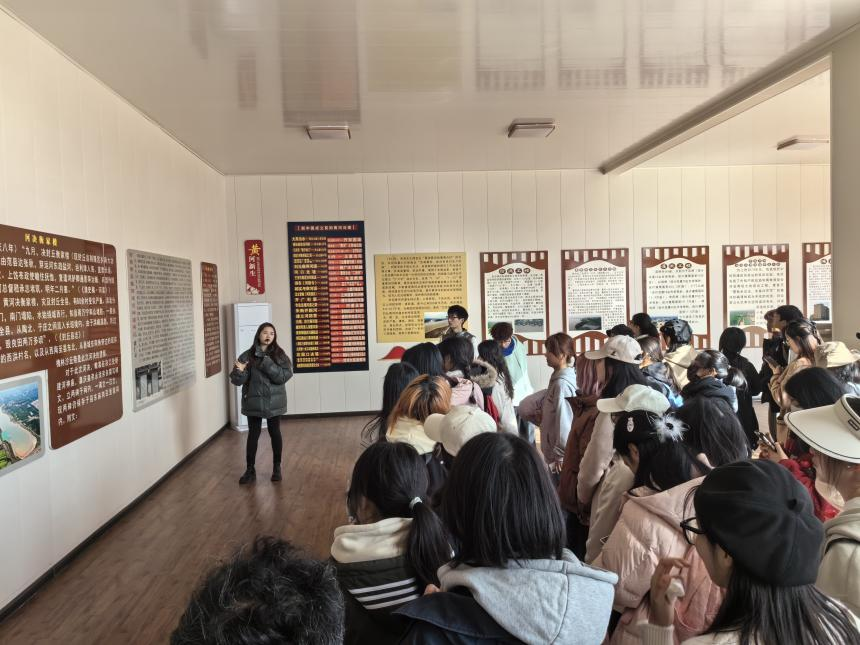 随后,师生代表一行参观了曹岗险工以及曹岗黄河文化苑。天光与白云共同“徘徊”于平静如镜的黄河,远天鸣白鹭,近水绕芳洲,此景美不胜收。在曹岗黄河文化苑,讲解员详细介绍了封丘与黄河的历史渊源和前人为治理黄河所做的各项工作。自古以来,黄河“三年两决口,百年一改道”,中华民族始终在与黄河水患灾害作斗争,期间留下了“大禹治水”“贾鲁治河”“于谦祭河” 等不朽佳话。在这一参观过程中,同学们重温历代治理黄河、保护黄河、建设黄河的艰辛,深刻感受到了“团结、务实、开拓、拼搏、奉献”的黄河精神,明白黄河保护重任在肩,深刻认识到总书记推动黄河流域生态保护和高质量发展的时代意义。