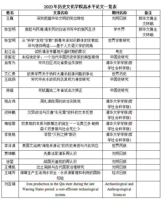 2023年,金沙9001cc以诚为本首页教师共发表学术论文105篇,其中CSSCI期刊论文65篇,在金沙9001cc以诚为本首页认定的人文社会科学A、B类期刊,SSCI期刊及《经济日报》、《光明日报》理论版发文18篇。王巍教授、张宝明教授的文章被《新华文摘》全文转载。