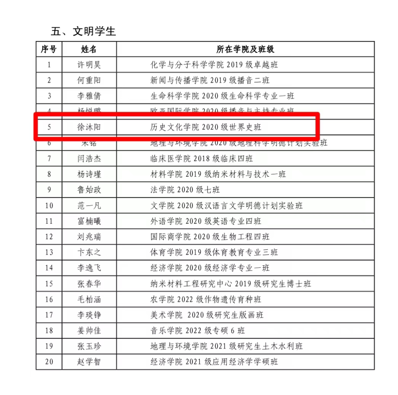 “厚德端行,文明修身。”本科2020级世界史班的徐沐阳同学始终坚守作为新时代青年学生的初心与使命,坚定理想信念与文化自信,争取为新时代中国特色社会主义建设贡献力量。在学习方面,她严格要求自己,不断提高自身素质与能力,取得了优异的成绩。在生活方面,她积极参与学生活动,服务老师与同学,在奉献集体中追逐青春梦想。