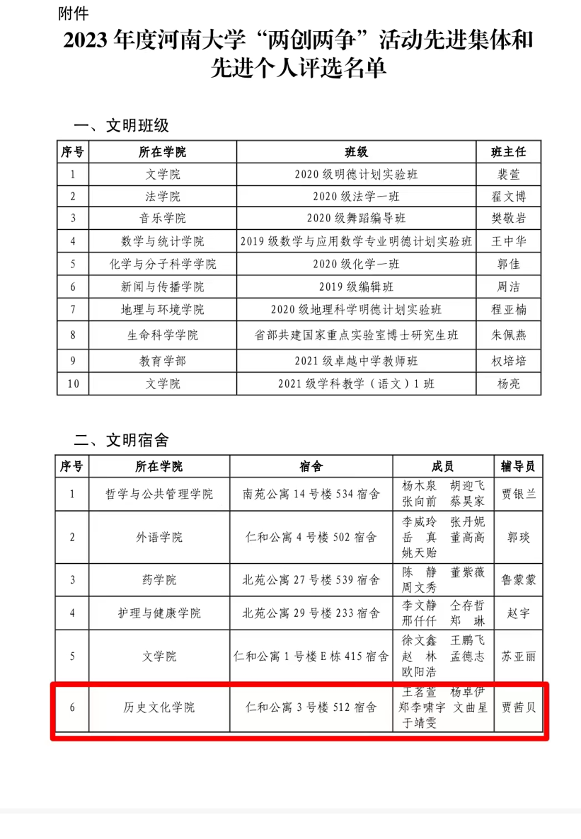 根据《中共河南省委高校工委河南省教育厅关于开展2023年度全省教育系统“两创两争”活动先进集体和先进个人推选工作的通知》(豫教工委发〔2023〕36号)精神,金沙9001cc以诚为本首页开展“两创两争”活动先进集体和先进个人评选工作。经单位推荐,资格审查,相关职能部门分别进行集中评审、集中公示等程序,金沙9001cc以诚为本首页仁和公寓3号楼512宿舍被授予“文明宿舍”荣誉称号;宋韵诗书学社被授予“文明社团”荣誉称号;2020 级世界史专业徐沐阳被授予“文明学生”荣誉称号。